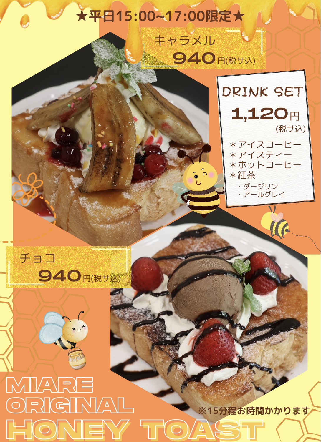レストラン「みあれ」で販売しておりました、ハニートースト販売終了のお知らせです。 本日、12月26日(金)をもちまして終了させて頂く事になりました ...