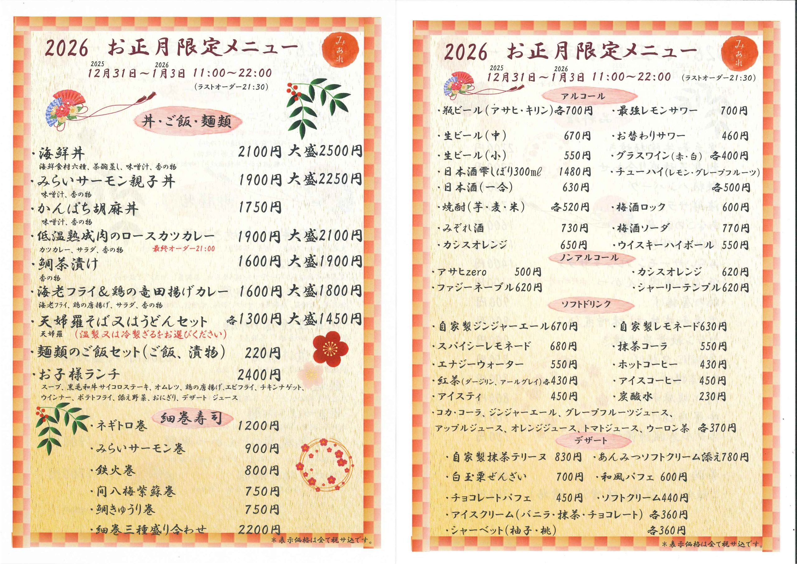 また、レストランみあれのご提供メニューが2025年12月31日(水)から2026年1月3日(土)までの期間は、年末年始の限定メニューになります!