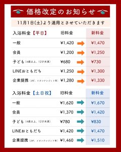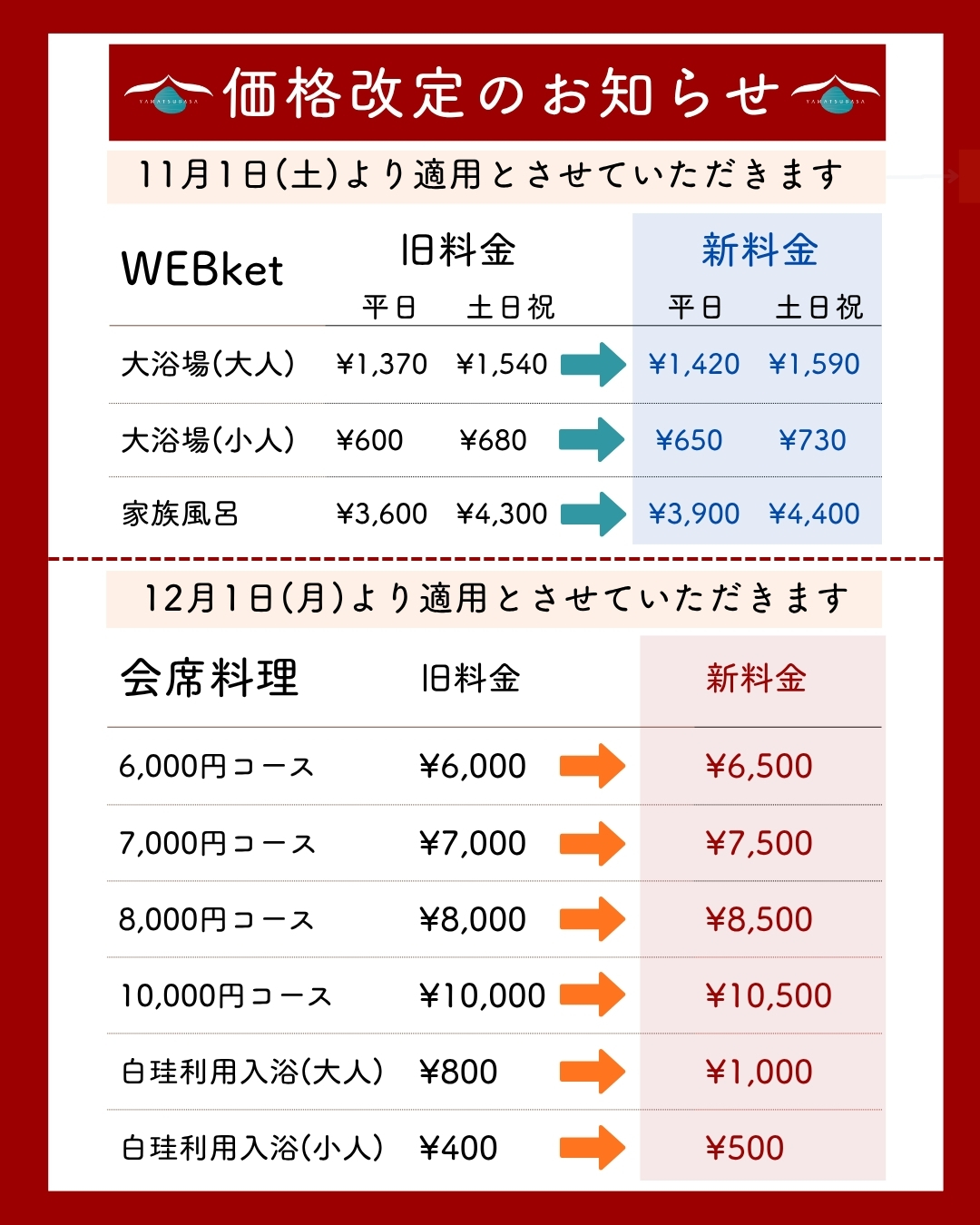 このたび、昨今の物価や光熱費の高騰、人件費の上昇に伴い、入浴料金および会席料理の料金を順次改定させていただくこととなりました。