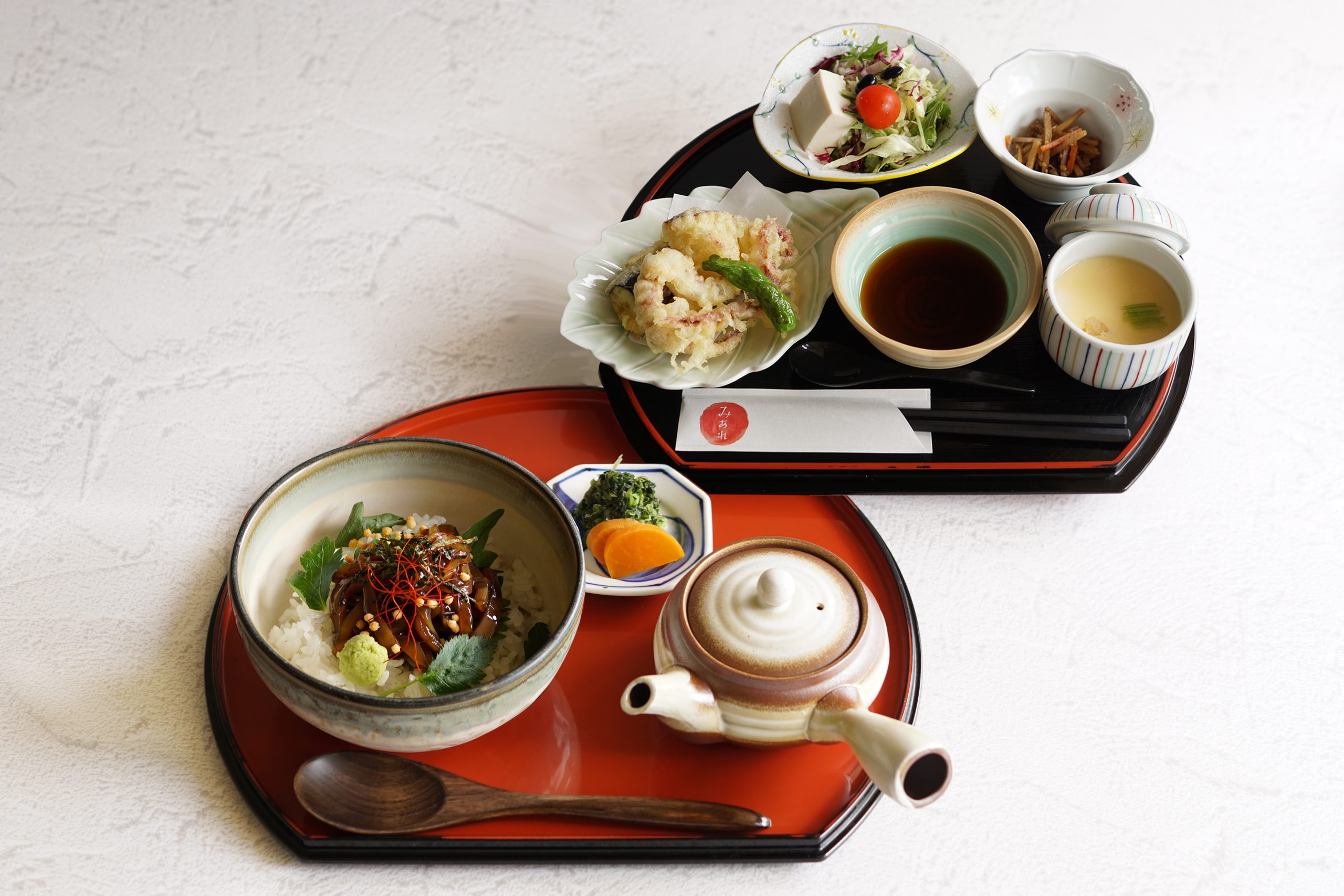 鐘崎天然イカの沖漬け茶漬け/いかと野菜の天ぷら/茶碗蒸し/小鉢/サラダ
